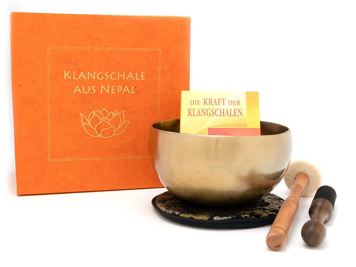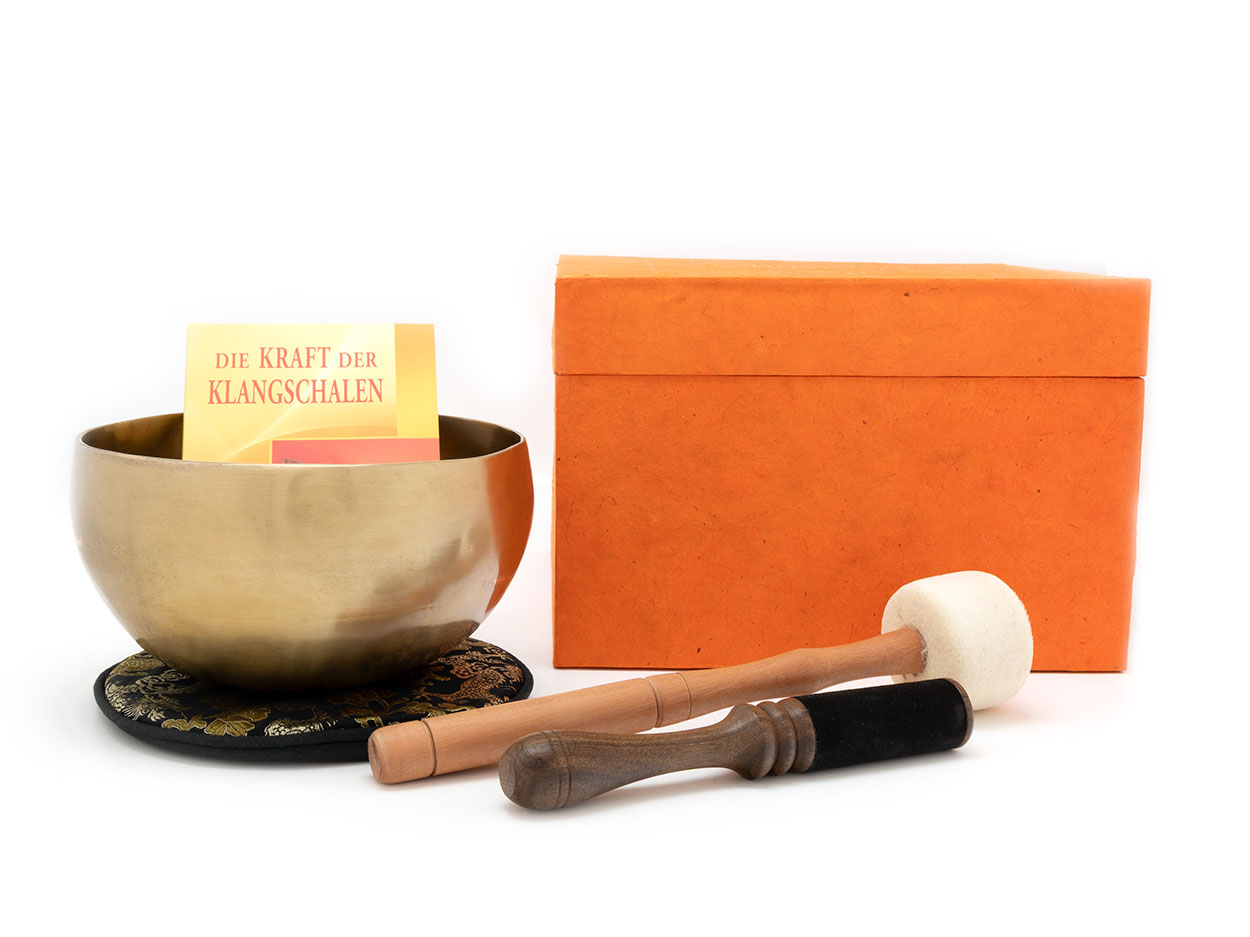 | einer mittelgroßen, massiven tibetischen Klangschale mit einem warmen, helleren Klang